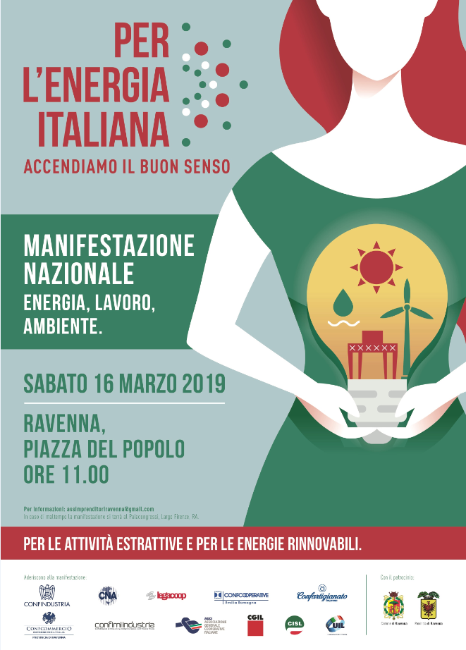 Sabato 16 marzo, alle ore 11.00, organizzazioni imprenditoriali e sindacati hanno promosso a Ravenna ( P.zza del Popolo ) una manifestazione nazionale per chiedere a Governo e Parlamento una strategia ragionata e condivisa sulla transizione energetica, nonché di rivedere la normativa sulle attività estrattive in un’ottica più graduale in quanto l’approvazione del DL Semplificazione ha posto un serio pregiudizio alla categorie di riferimento.