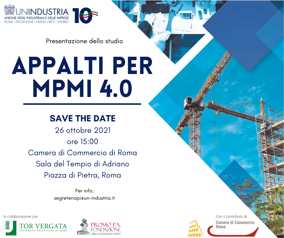 Lo studio “Appalti per MPMI 4.0” nasce con l’obiettivo di approfondire, a partire da un’analisi quali-quantitativa sulla competitività delle piccole e medie imprese nel mercato delle opere pubbliche del Lazio, le condizioni per una maggiore presenza di queste nel sistema regionale degli appalti pubblici.