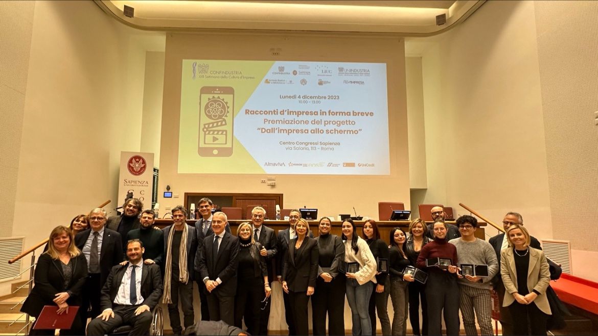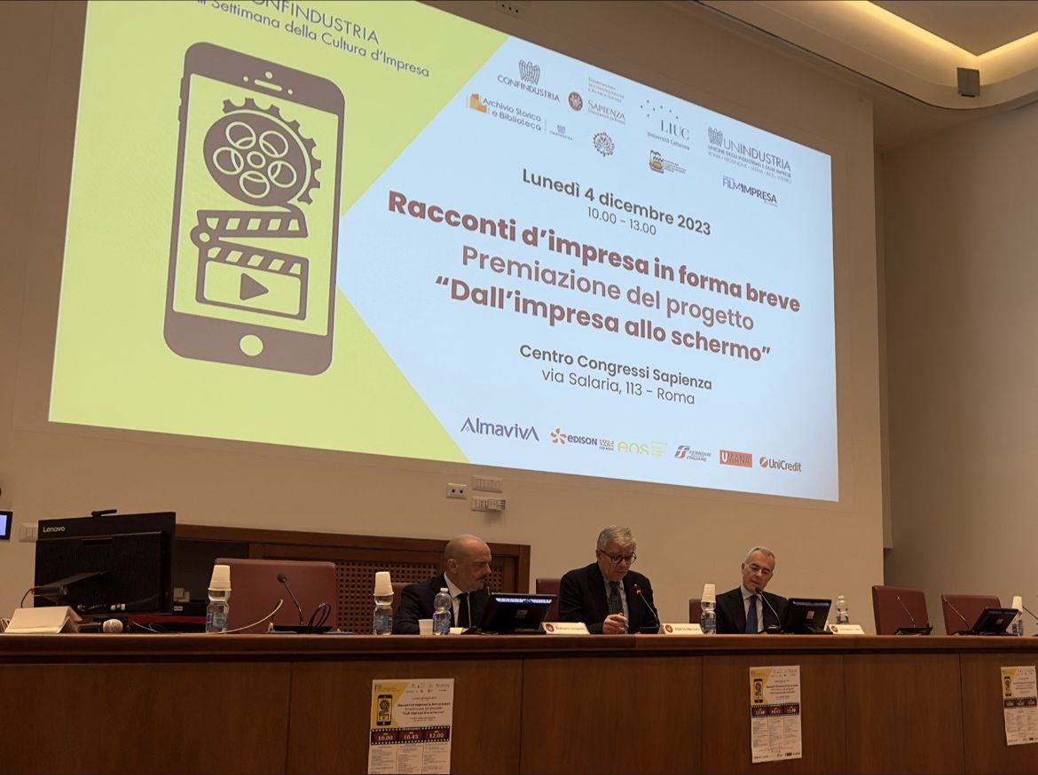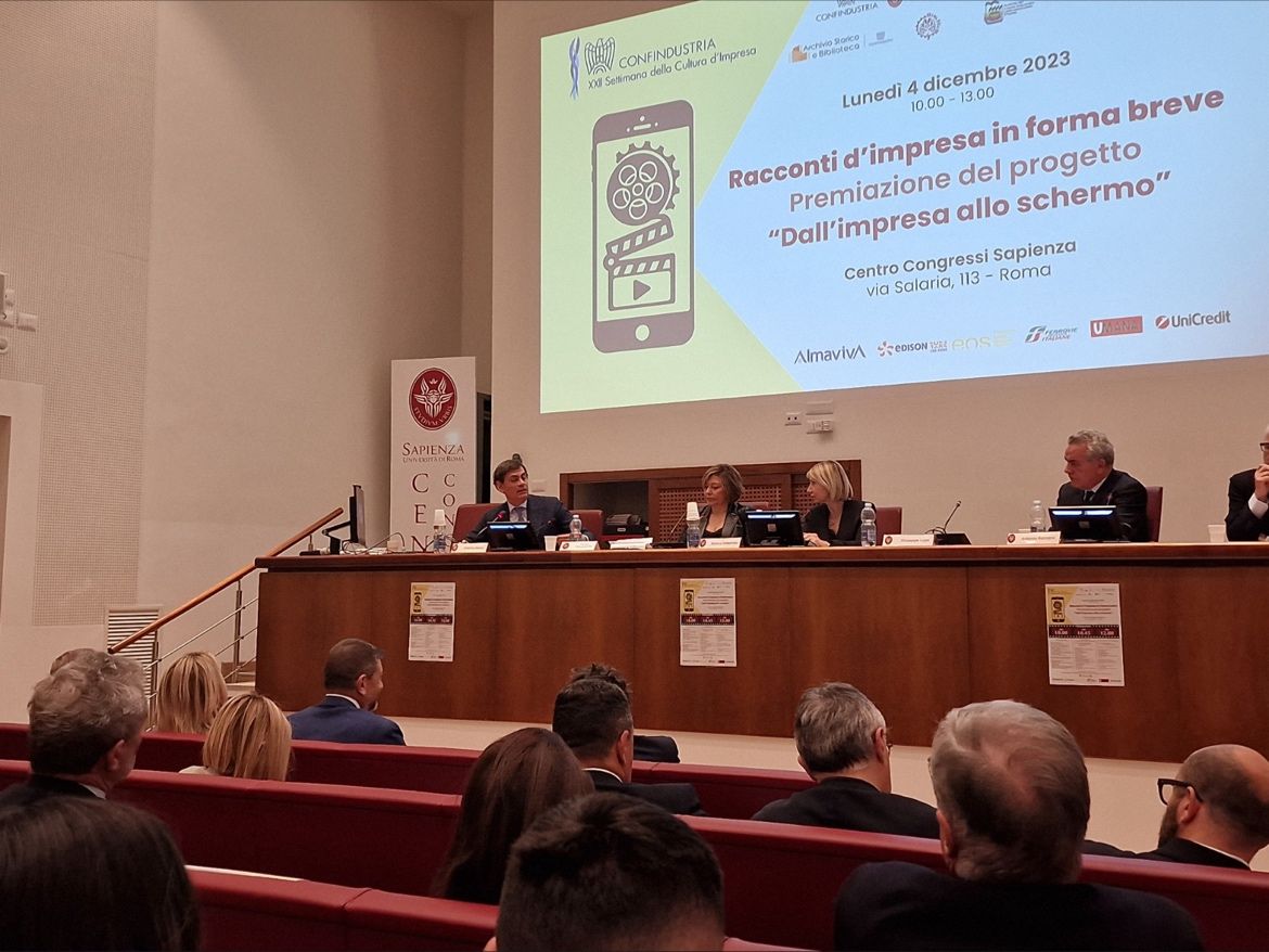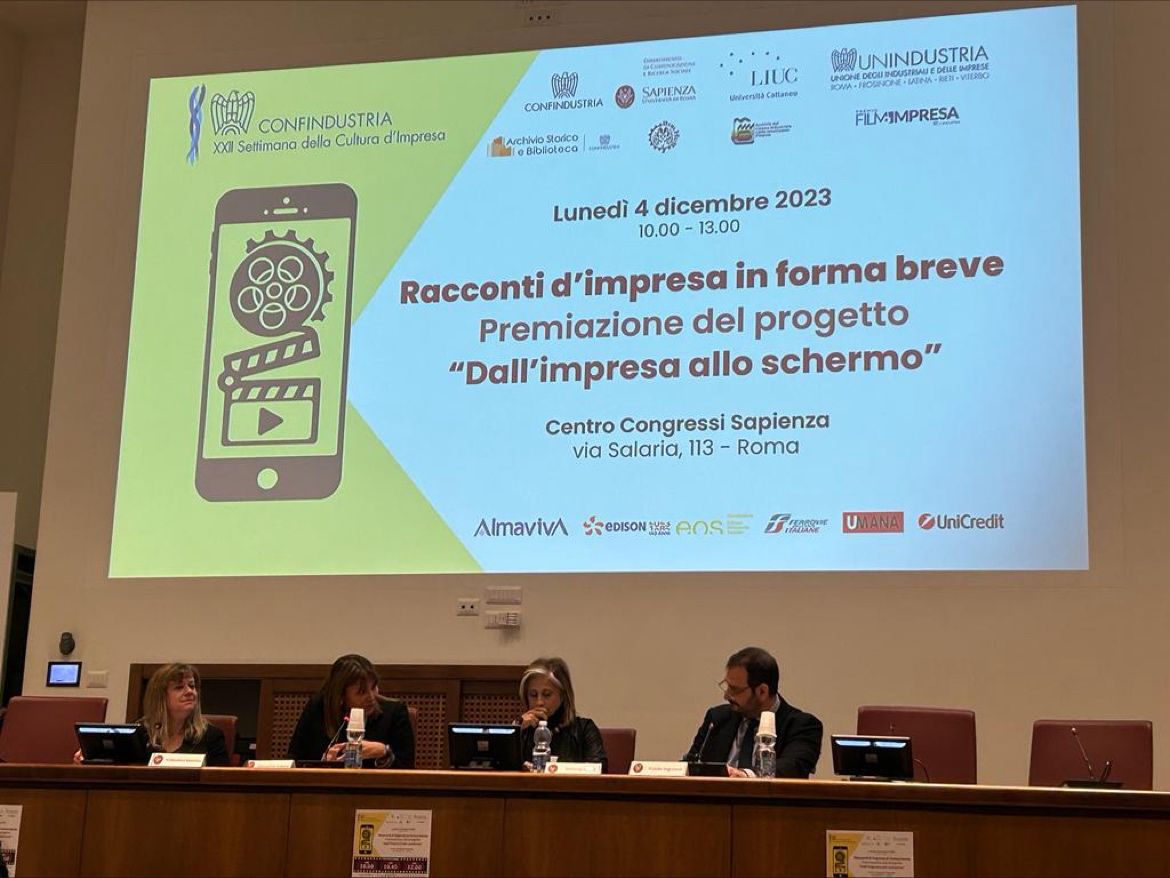 Un viaggio nella cultura d’impresa attraverso il linguaggio dei filmati industriali e della narrazione audiovisiva. E’ il progetto “Dall’impresa allo schermo. Videoracconti e storie in forma breve”, ideato da Confindustria con il suo Archivio Storico – Biblioteca, dal Dipartimento di Comunicazione e Ricerca Sociale dell’Università degli Studi di Roma La Sapienza con la biblioteca di letteratura e cultura d’impresa BiblHuB, dalla Liuc con l’Archivio del Cinema Industriale e della Comunicazione d’Impresa e da Unindustria, che partecipa con il Premio Film Impresa. Oggi a Roma, presso il Centro Congressi dell’Università La Sapienza, si è tenuta la cerimonia di premiazione, che ha ospitato anche la tavola rotonda “Dialoghi interdisciplinari sull’impresa”, con i rappresentanti del mondo dell’Università, delle imprese e della comunicazione.