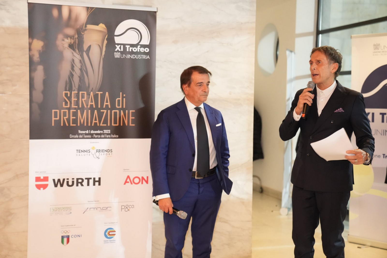 Venerdì 1° dicembre 2023, al Circolo del Tennis del Foro Italico, si è tenuta la serata di premiazione dei vincitori, condotta dal giornalista Sky Stefano Meloccaro, a cui hanno partecipato ospiti illustri tra cui il past president Unindustria Luigi Abete, il Presidente di Tennis and Friends Giorgio Meneschincheri e l'allenatore ed ex tennista Vincenzo Santopadre, insieme a tanti imprenditori e manager di multinazionali, piccole medie e grandi imprese italiane. La manifestazione sportiva, infatti, coordinata dal vice presidente Unindustria Stefano Cenci, è diventata ormai un classico appuntamento di networking e sport per la nostra Associazione, ed è stata sponsorizzata quest'anno da Wuerth in qualità di Main Sponsor e AON, annoverando tra gli sponsor tecnici anche Csain, Tecnoconference, Pezzilli & Co e Mizar.
