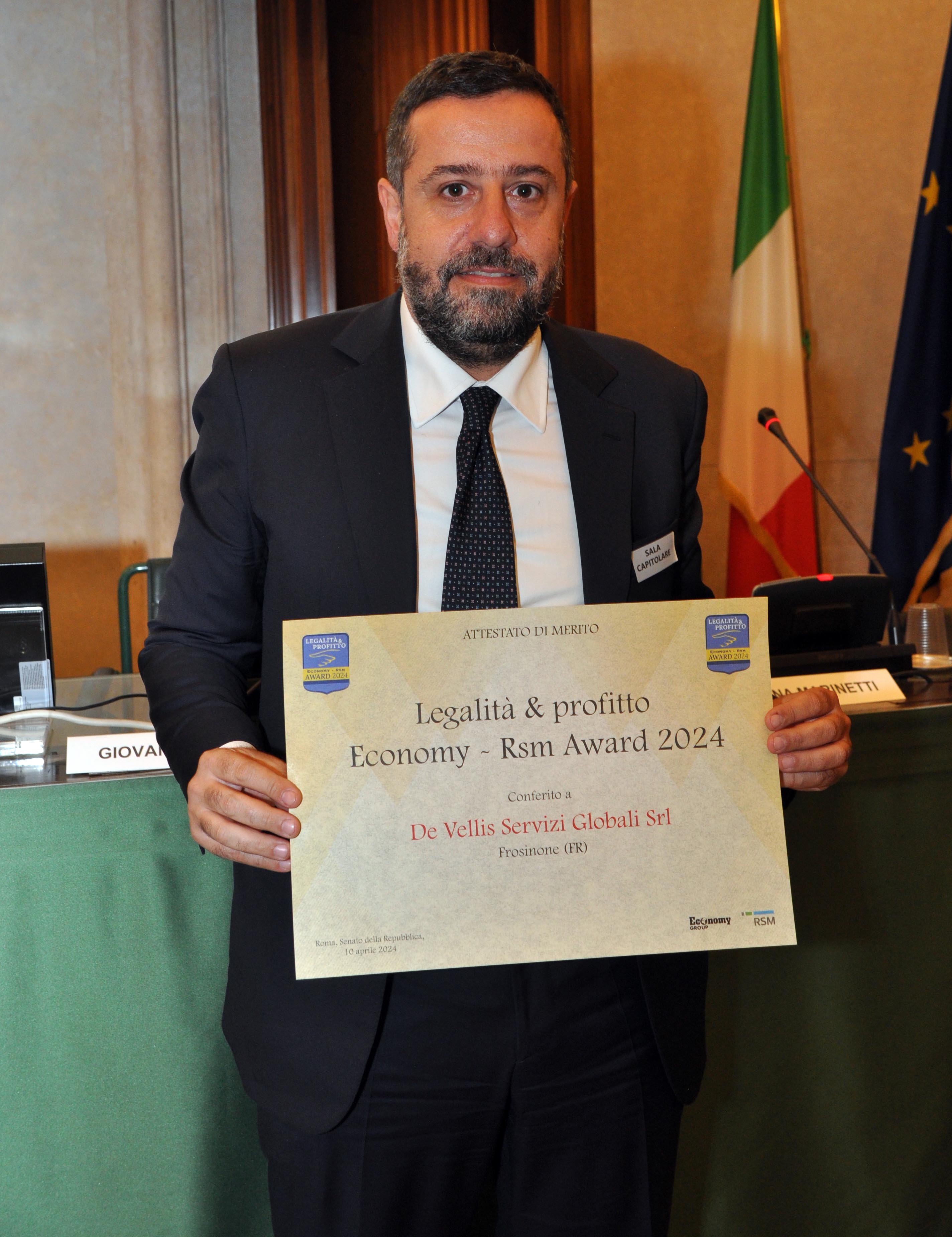 Lo scorso 10 aprile a Roma l'azienda associata De Vellis di Frosinone, leader nel settore dei traslochi, è stata insignita del prestigioso Riconoscimento del Rating di Legalità, presso la Sala della Minerva del Senato della Repubblica, nel corso dell’evento organizzato da Economy Group.