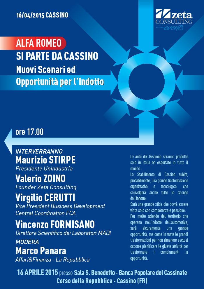 L'evento, organizzato da Zeta Consulting, si terrà a Cassino il prossimo giovedì 16 aprile 2015 alle ore 17.00, presso la Banca Popolare del Cassinate in Corso della Repubblica.