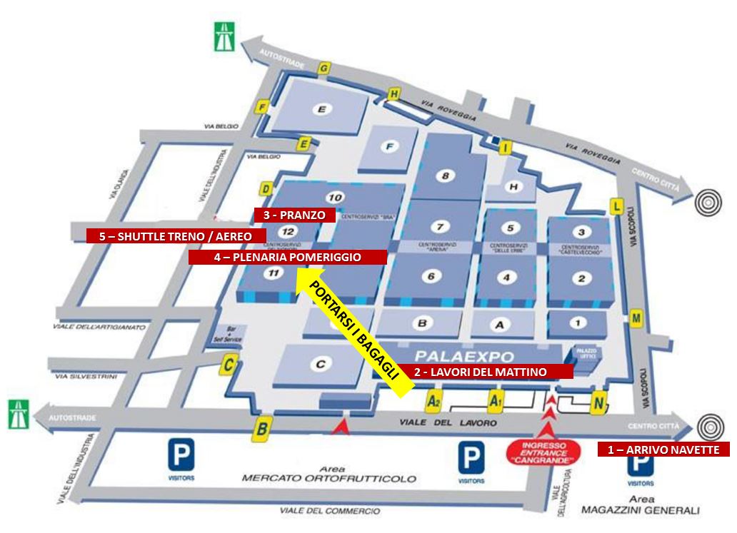 Infatti, per l’uscita dall’evento al termine dei lavori della plenaria, gli organizzatori hanno messo a disposizione un SERVIZIO SHUTTLE PER L’AEROPORTO E PER LA STAZIONE FERROVIARIA DI VERONA PROPRIO IN PROSSIMITÀ DEI PADIGLIONI 12 E 11 (punto 5 in rosso nella mappa).