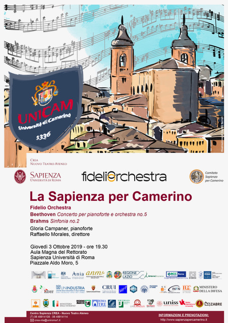 Il 3 ottobre 2019, alle ore 19.30, presso l'Aula Magna - Auditorium della "Sapienza" Università di Roma, si terrà un concerto di beneficienza che ha lo scopo di reperire fondi per la ricostruzione dell'antica biblioteca dell'Università di Camerino, risalente al XIV secolo, fortemente danneggiata dal terremoto del 2016, e dell'allestimento di un'aula informatica, attrezzata con 20 postazioni di lavoro per lezioni e libero utilizzo, fornendo così un necessario strumento di conoscenza a studenti e professori del corso di dottorato in Gestione del Rischio della suddetta Università.