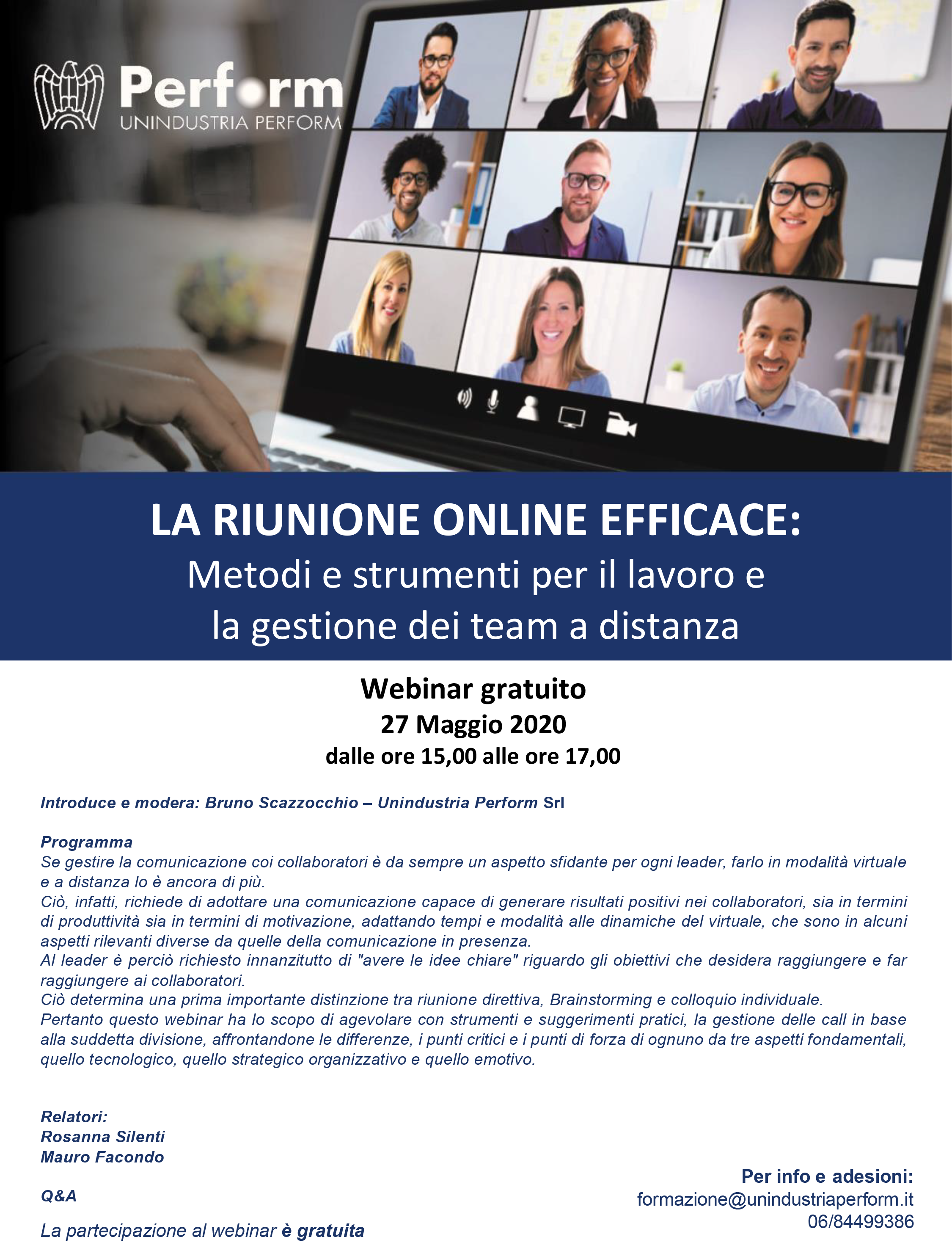 Dopo il primo webinar dedicato allo Smart Working del 22 aprile scorso , Unindustria Perform promuove un secondo incontro sulla gestione della comunicazione coi collaboratori che è da sempre un aspetto sfidante per ogni leader, farlo in modalità virtuale e a distanza lo è ancora di più.