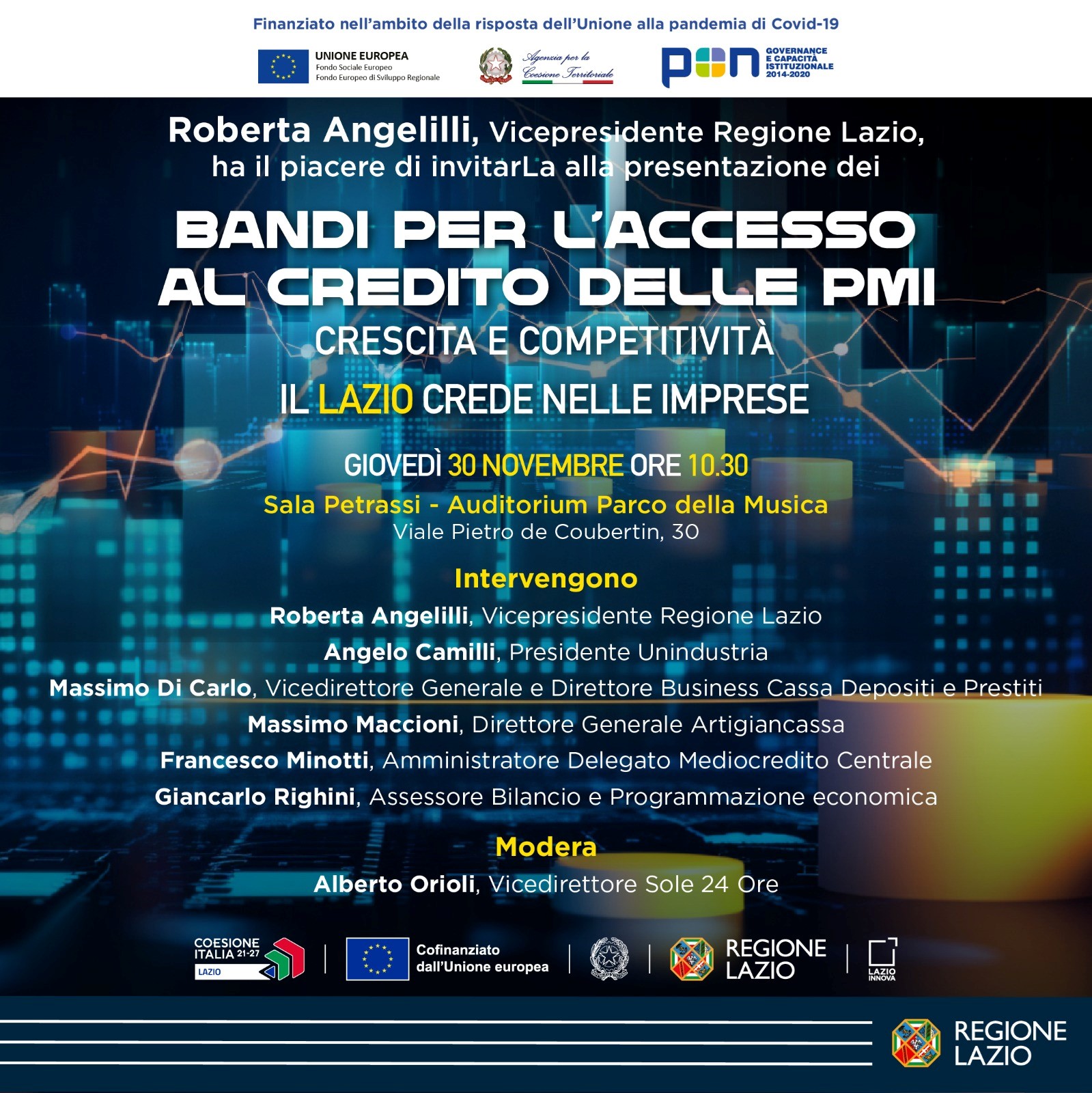 Giovedì 30 novembre alle ore 10.30 si terrà l'incontro promosso dalla Regione Lazio di presentazione dei Bandi per l’accesso al credito delle PMI, 135 milioni per la crescita e la competitività.