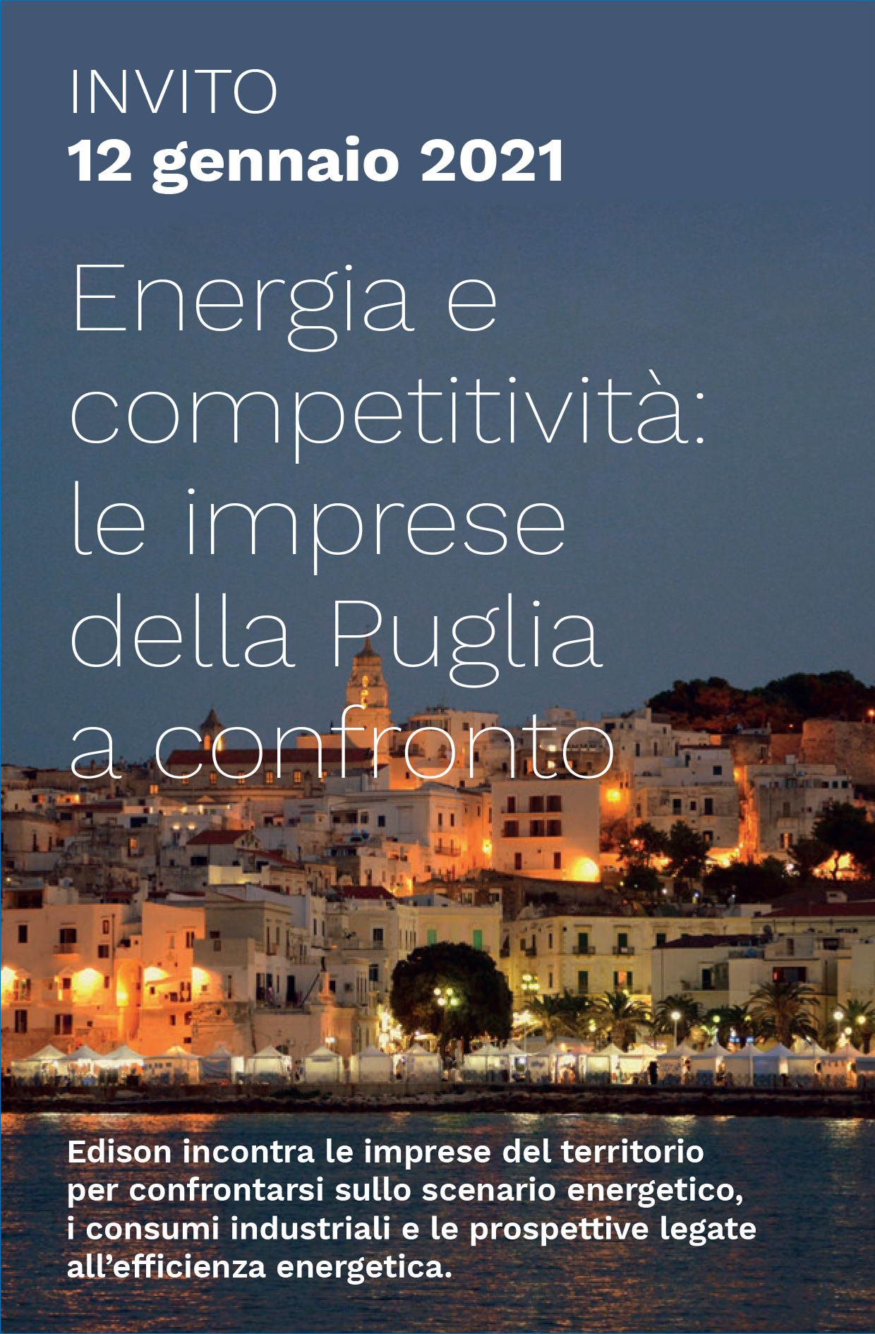 Si segnala l’interessante webinar promosso da Edison in collaborazione con Confindustria Puglia su Energia e Competitività per il 12 Gennaio p.v. alle ore 10.