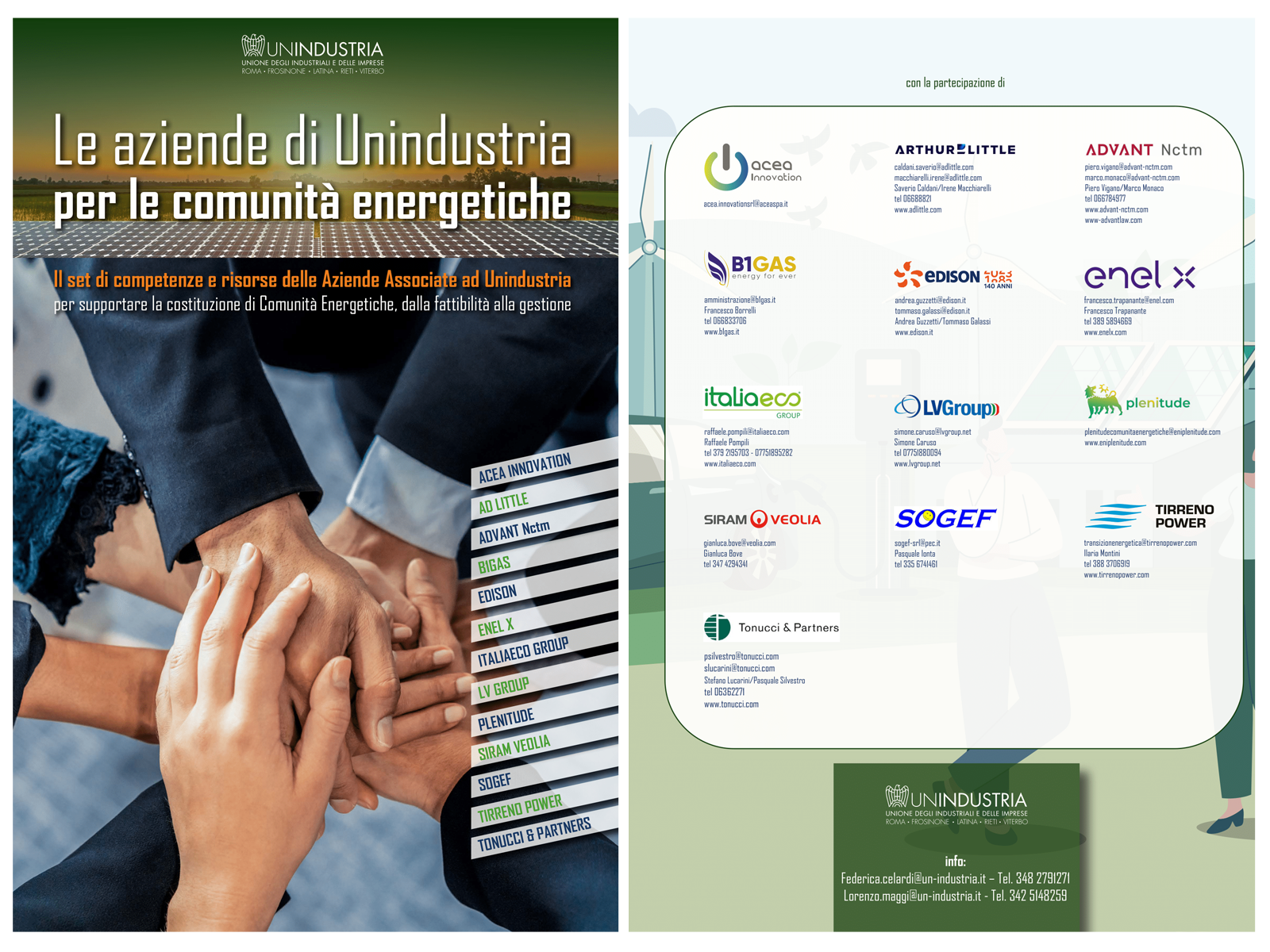 Dopo l’entrata in vigore del Decreto per la creazione e lo sviluppo delle Comunità energetiche rinnovabili (CER) e per l’autoconsumo diffuso in Italia, Unindustria presenta 13 aziende associate pronte a sostenere e promuovere attivamente il processo di costituzione di una CER.