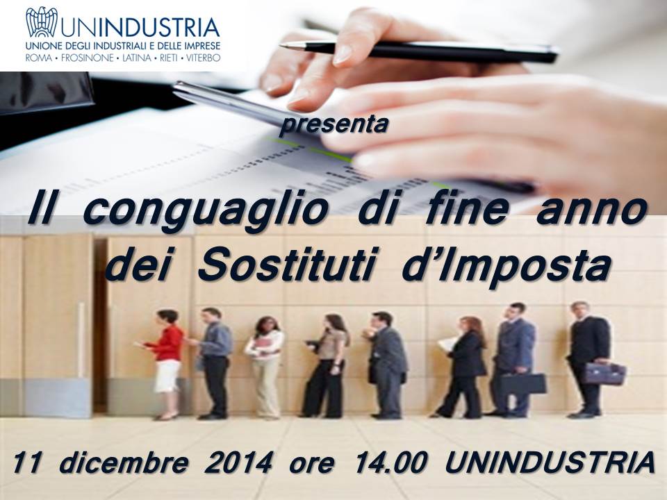 Unindustria invita tutti gli operatori interessati delle aziende associate, giovedì 11 dicembre 2014 alle ore 14.00 presso la sede di Unindustria, al consueto appuntamento di fine anno sul conguaglio dei sostituti d'imposta.