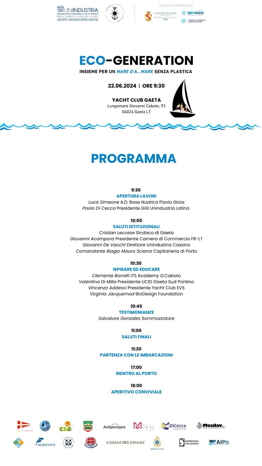 "Eco Generation, per un mare d'a...mare”, una iniziativa che guarda con attenzione all’ambiente e finalizzata alla sensibilizzazione e attivazione sul tema urgentissimo dei rifiuti marini, è quella promossa dal Gruppo Giovani Imprenditori di Unindustria Latina, guidato dal Presidente Paolo di Cecca, e dalla Base Nautica Flavio Gioia di Gaeta con l’Amministratore delegato Luca Simeone.