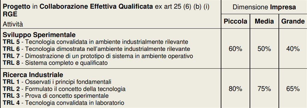Qualora un Progetto sia realizzato in Collaborazione Effettiva l’intensità di Aiuto concedibile alle Imprese è incrementata come rappresentato nella tabella che segue, solo qualora la Collaborazione Effettiva sia Qualificata, vale a dire qualora il Progetto soddisfi almeno una delle seguenti due condizioni:
