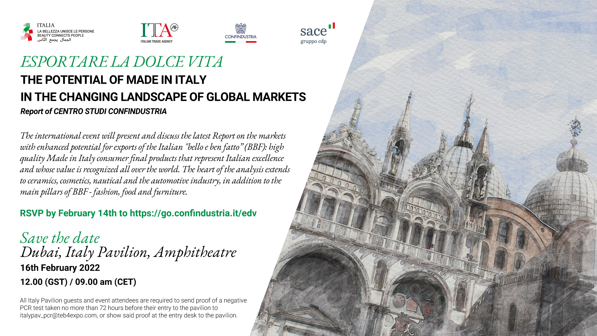 Il prossimo 16 febbraio, a partire dalle ore 12.00 (Dubai)/9:00 (Roma), Confindustria e SACE, in collaborazione con il Commissariato Generale dell’Italia per Expo 2020 Dubai e ICE Agenzia, organizzano l’evento di presentazione del Rapporto 2021 “Esportare la Dolce Vita – il potenziale del Made in Italy nel panorama internazionale che cambia” presso il Padiglione Italia di Expo Dubai 2020.