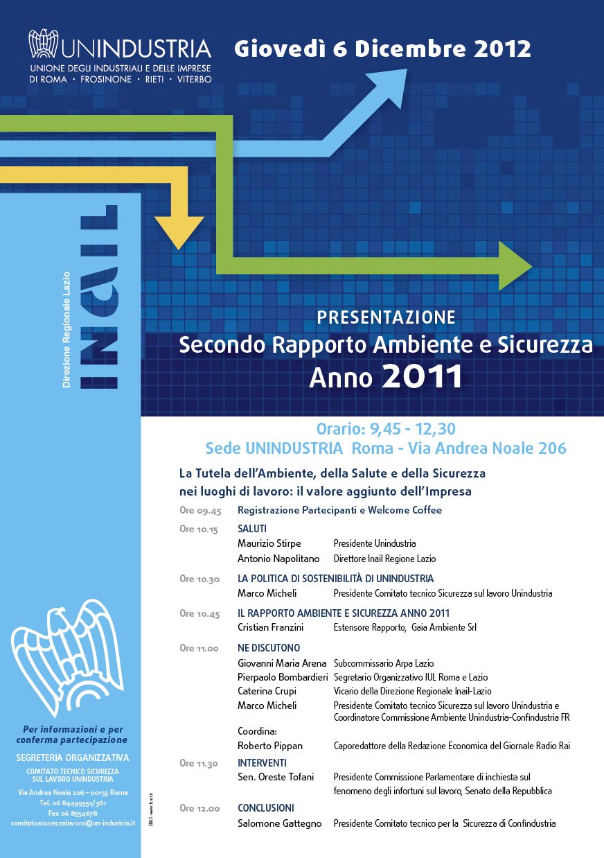 Il 6 Dicembre 2012, con inizio alle ore 9.45, si svolgerà - presso la nostra Sede di Roma in via Andrea Noale 206 - il nostro appuntamento annuale per un confronto con le istituzioni, le imprese e le parti sociali sui temi della salute e sicurezza nei luoghi di lavoro.