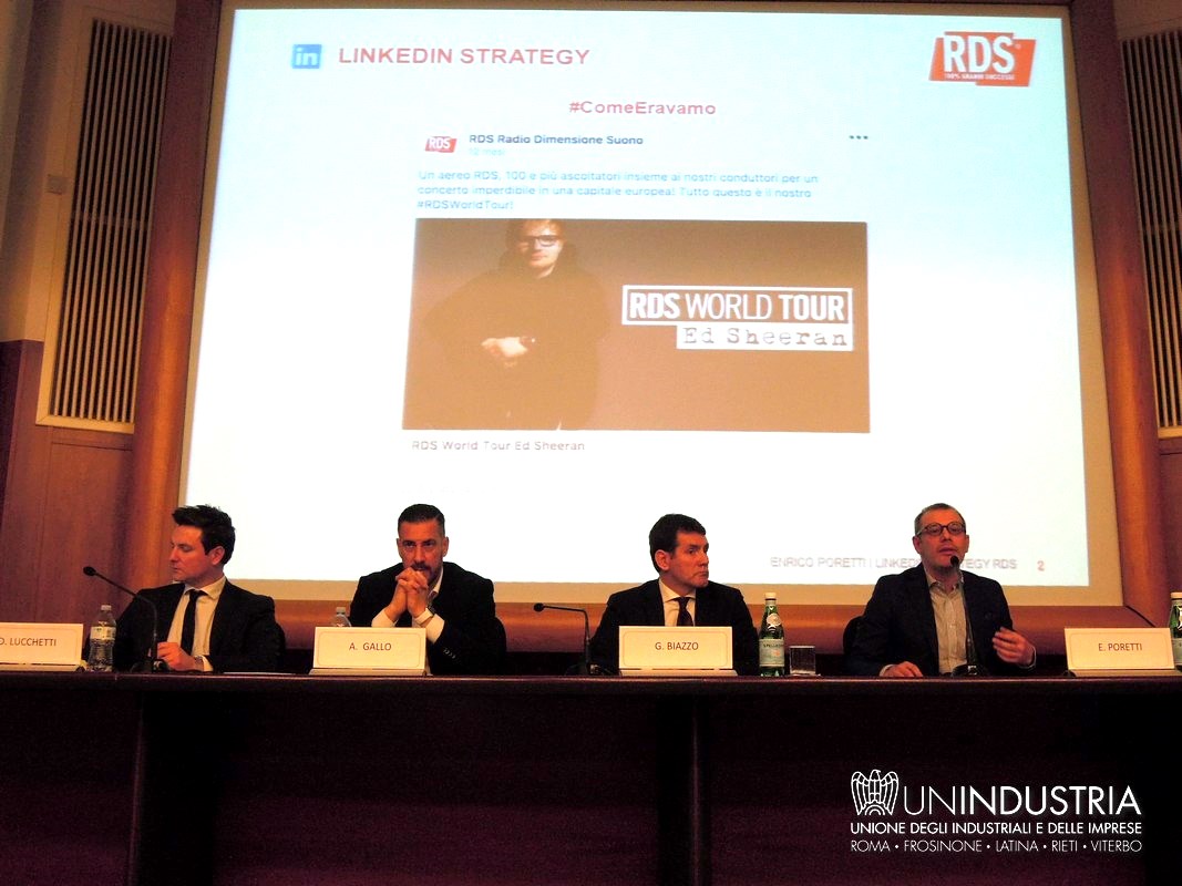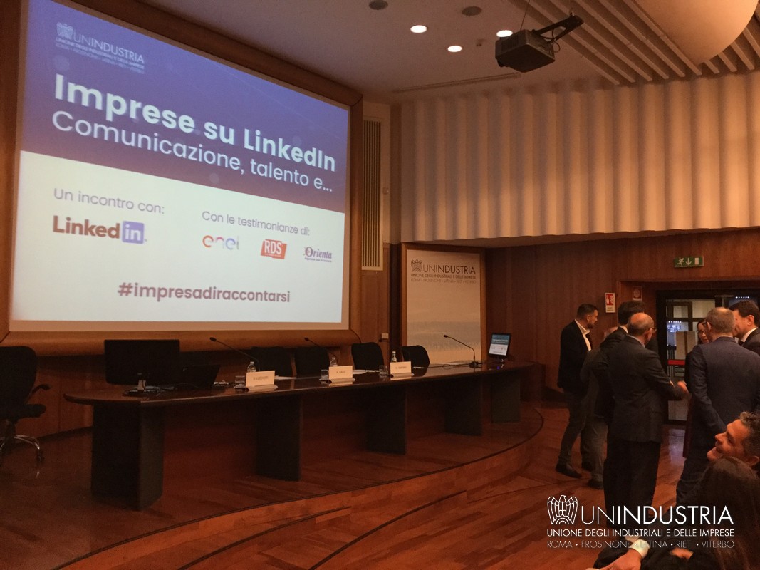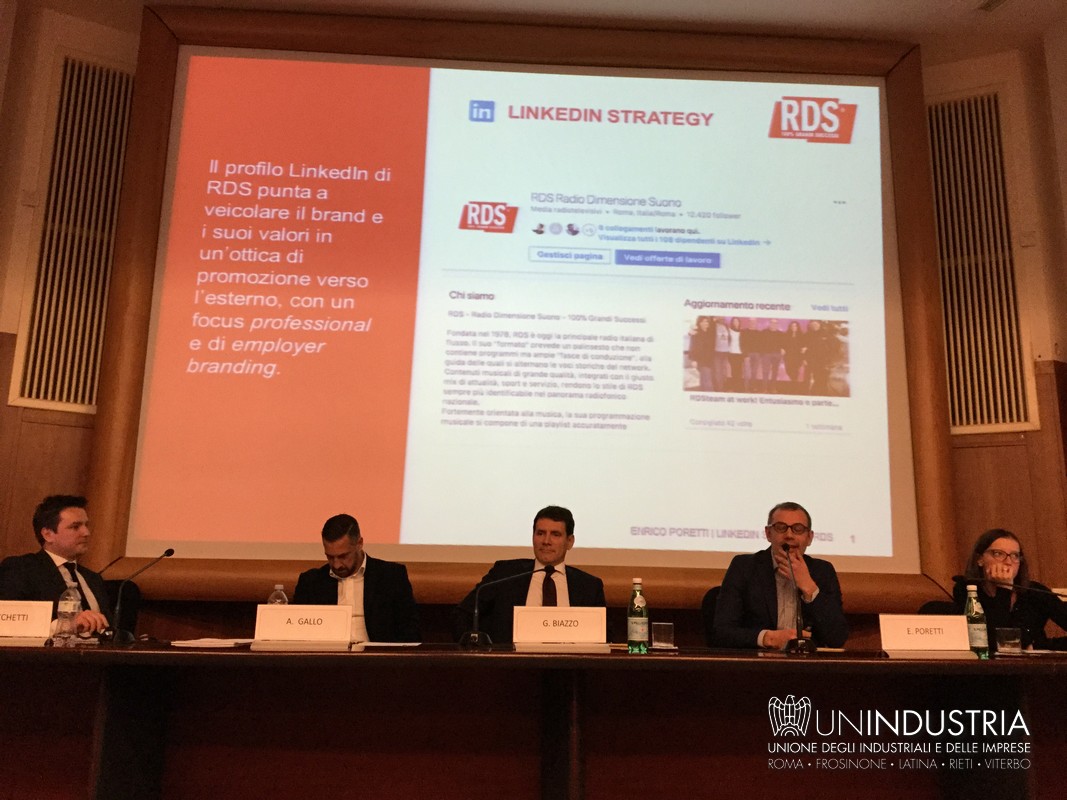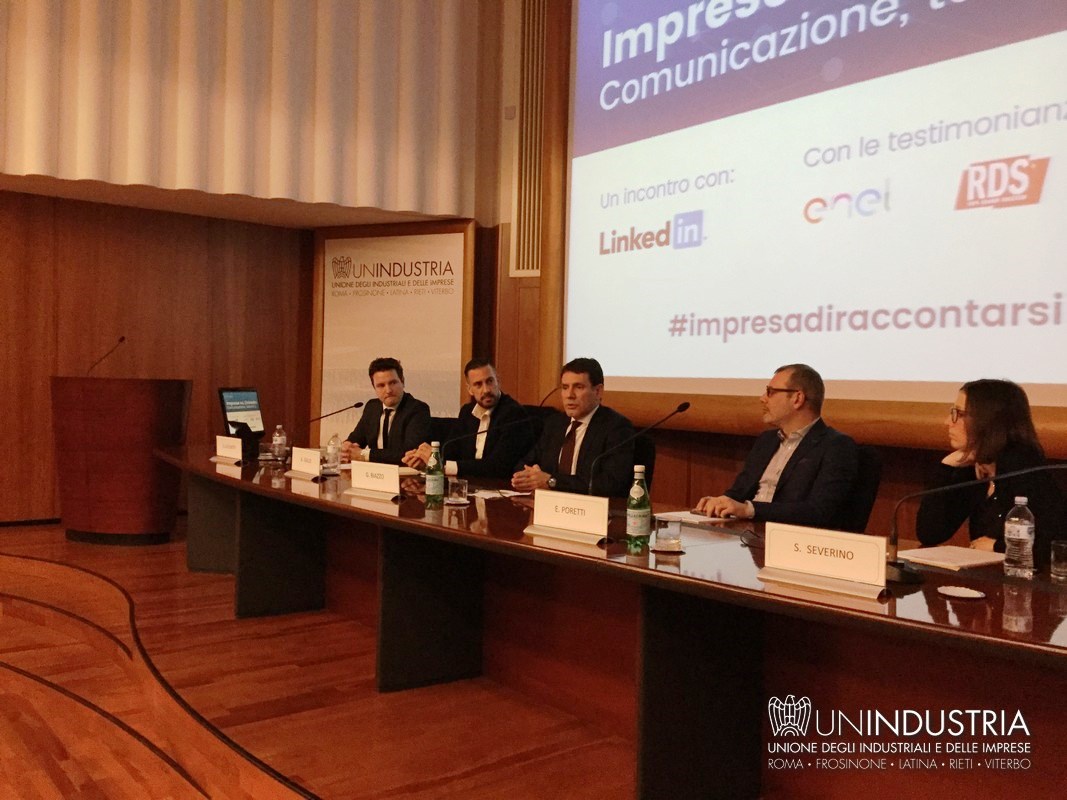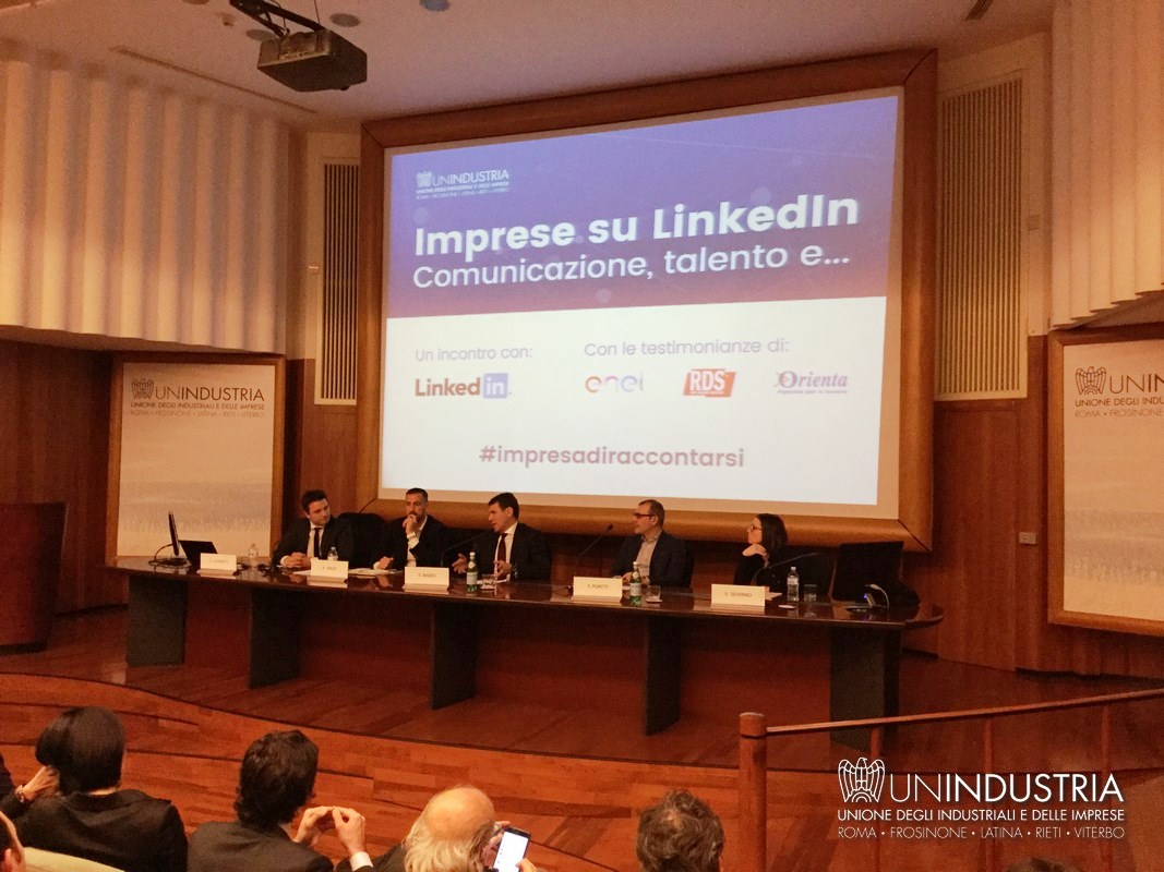 All'appuntamento hanno partecipato Gerardo Iamunno, Presidente del Comitato Piccola Industria di Unindustria, Alessandro Gallo, Partner e Public Sector Account Manager LinkedIn, Giuseppe Biazzo, Presidente Gruppo Tecnico Sviluppo del Capitale Umano Unindustria e amministratore delegato di Orienta Spa, Sara Severino, Head of recruiting di Enel ed Enrico Poretti, Digital content director di Rds Radio Dimensione Suono. Ha moderato l'incontro Davide Lucchetti, coordinatore scientifico per Unindustria del percorso "L'Impresa di Raccontarsi".