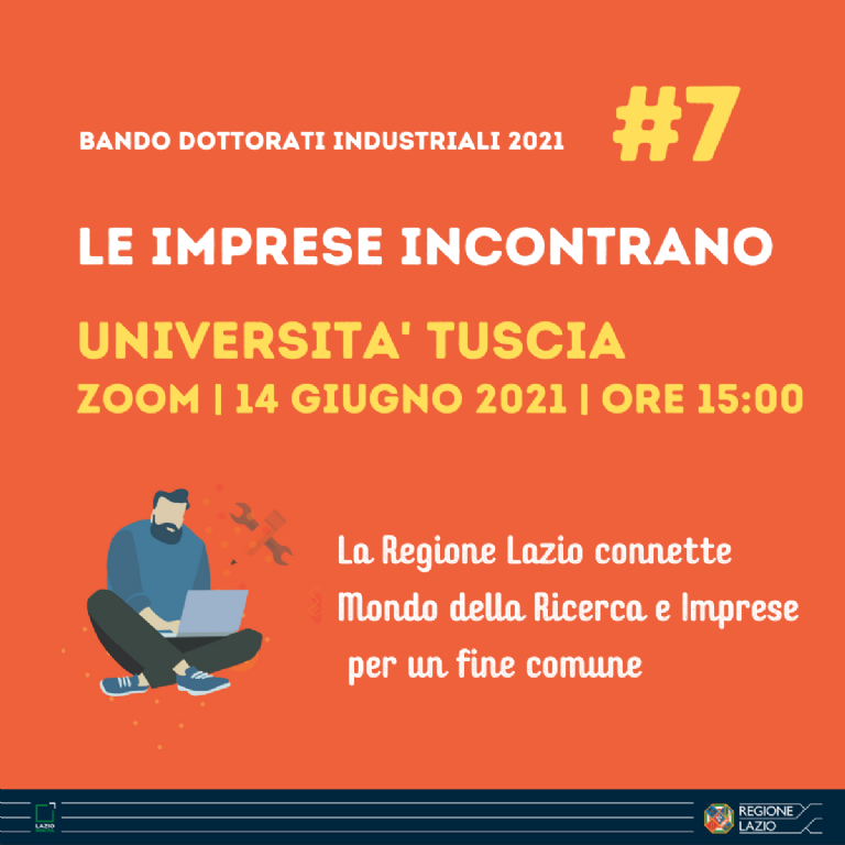 Lunedì 14 giugno 2021 alle ore 15.00 si svolgerà il settimo incontro online dedicato all’offerta dell’Università degli Studi della Tuscia all’interno del ciclo di Networking Days tra Mondo dell’Impresa e Mondo della Ricerca dedicati al nuovo Avviso pubblico “Intervento per il rafforzamento della ricerca nel Lazio - incentivi per i dottorati di innovazione per le imprese” - Annualità 2021.