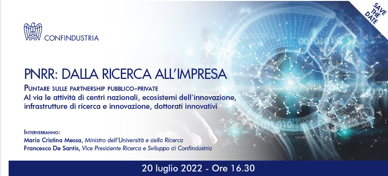 Per favorire un’ampia e qualificata partecipazione delle imprese al Piano, in collaborazione con il Ministero dell'Università e della Ricerca, Confindustria ha organizzato l’incontro “PNRR: dalla Ricerca all’Impresa. Puntare sulle partnership pubblico-private”, che si svolgerà a Roma il 20 luglio p.v. alle ore 16.30.
