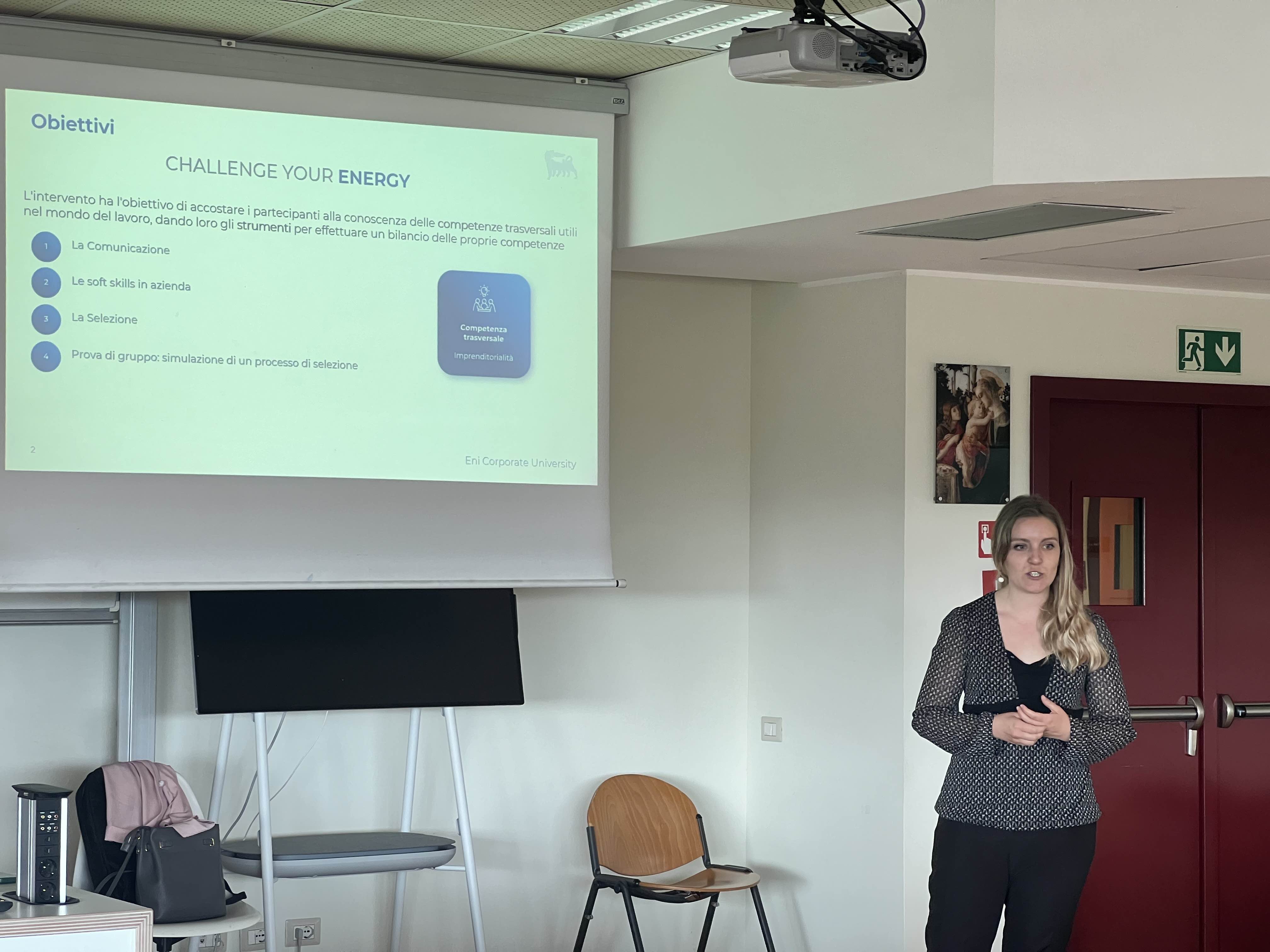 L’intervento di ENI Corporate University SpA dal titolo “Challenge your energy” ha avuto l’obiettivo di avvicinare i partecipanti alla conoscenza delle competenze trasversali utili nel mondo del lavoro, dando loro gli strumenti per effettuare un bilancio delle proprie competenze. Si è partiti dalle esperienze dei partecipanti, per individuare quelle che sono le soft skills più richieste in fase di selezione, focalizzandosi sulla loro importanza anche ai fini della crescita professionale in azienda.