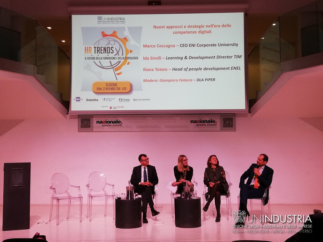 Dopo l'entusiasmante intervento "Change!" di Alberto Mattiacci, Ordinario di Economia e Gestione delle Imprese della Società Italiana Marketing, la tavola rotonda sui “Nuovi approcci e strategie nell’era delle competenze digitali” ha approfondito  il tema dell’impatto del digitale e delle nuove tecnologie nel mondo del lavoro, cercando di identificare le nuove competenze richieste per assicurare il mantenimento di elevati standard di performance in azienda. Ne hanno discusso: Marco Coccagna, CEO Eni Corporate University, Ida Sirolli, Learning & Development Director Tim e Iliana Totaro, Head of People Development Holding Enel, con la moderazione di Giampiero Falasca, Partner DLA Piper.