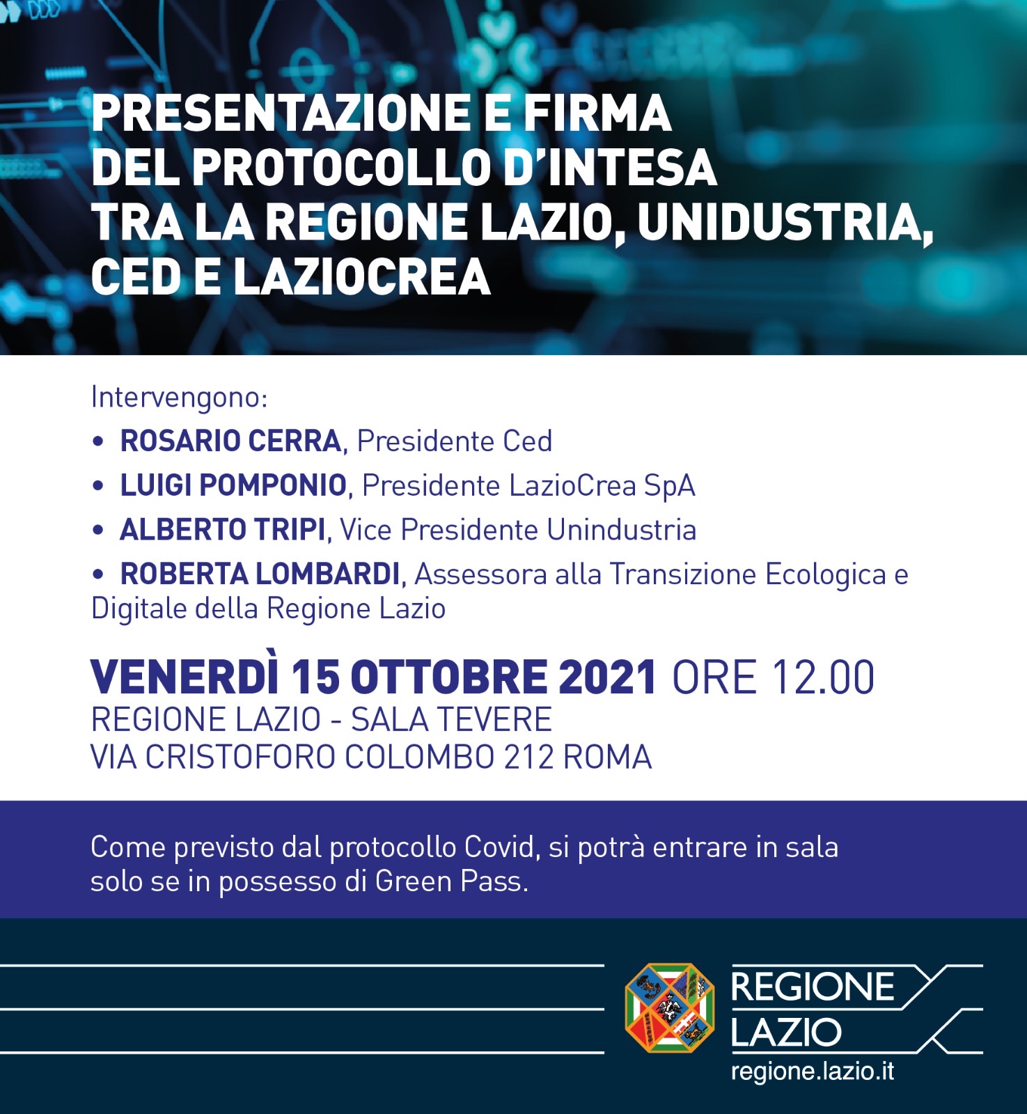 Saranno presenti per Unindustria Alberto Tripi Vice presidente con delega alla Trasformazione digitale, Rosario Cerra Presidente Ced e Luigi Pomponio Presidente LazioCrea SpA.