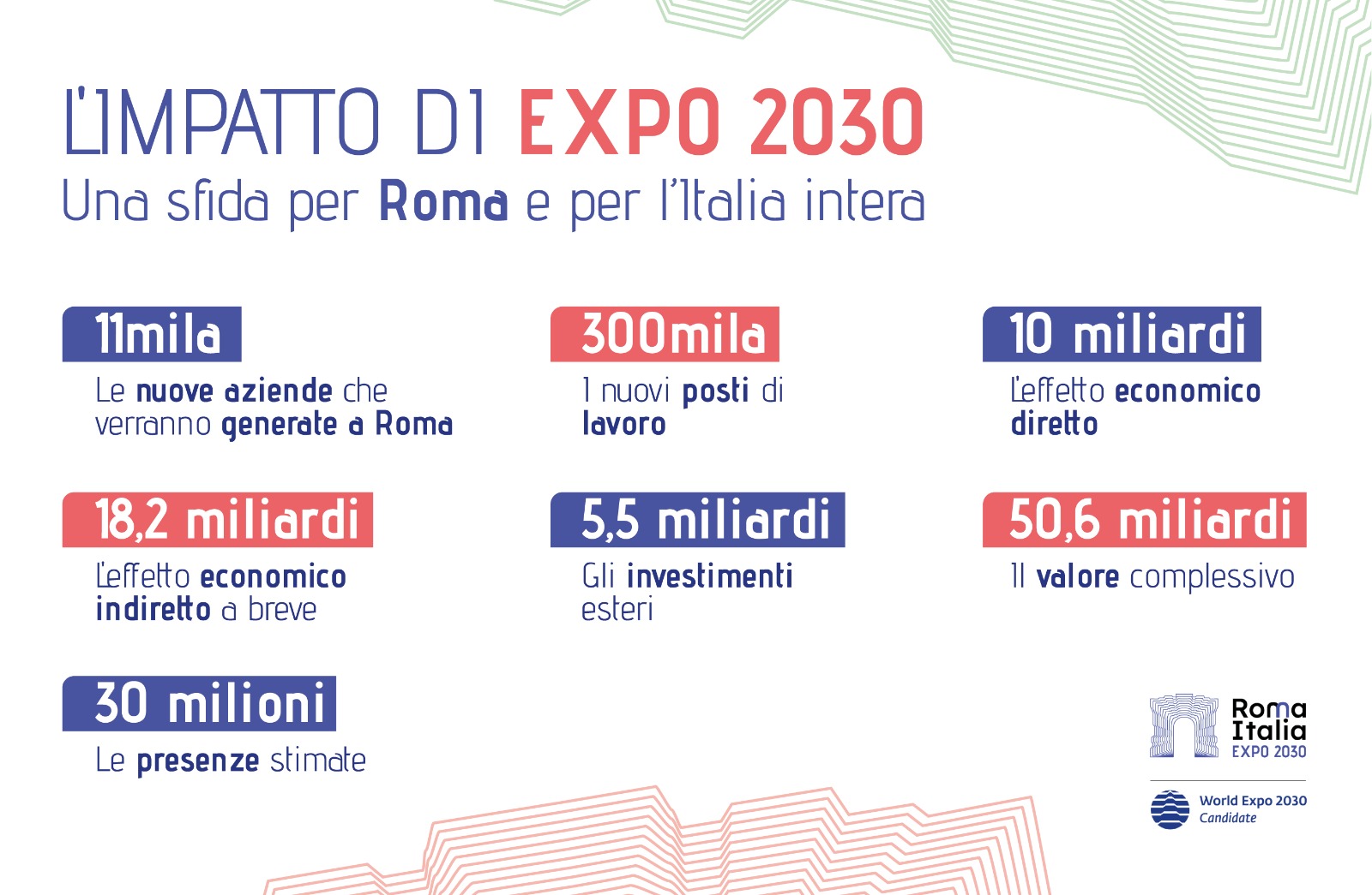 Non solo Capitale. I numeri di Expo Roma 2030 sono da capogiro e riguardano l'intero sistema Paese: l'Esposizione Universale vale la nascita di 11mila aziende e la creazione di quasi 300mila posti di lavoro, principalmente a beneficio delle regioni del Centro-Sud.