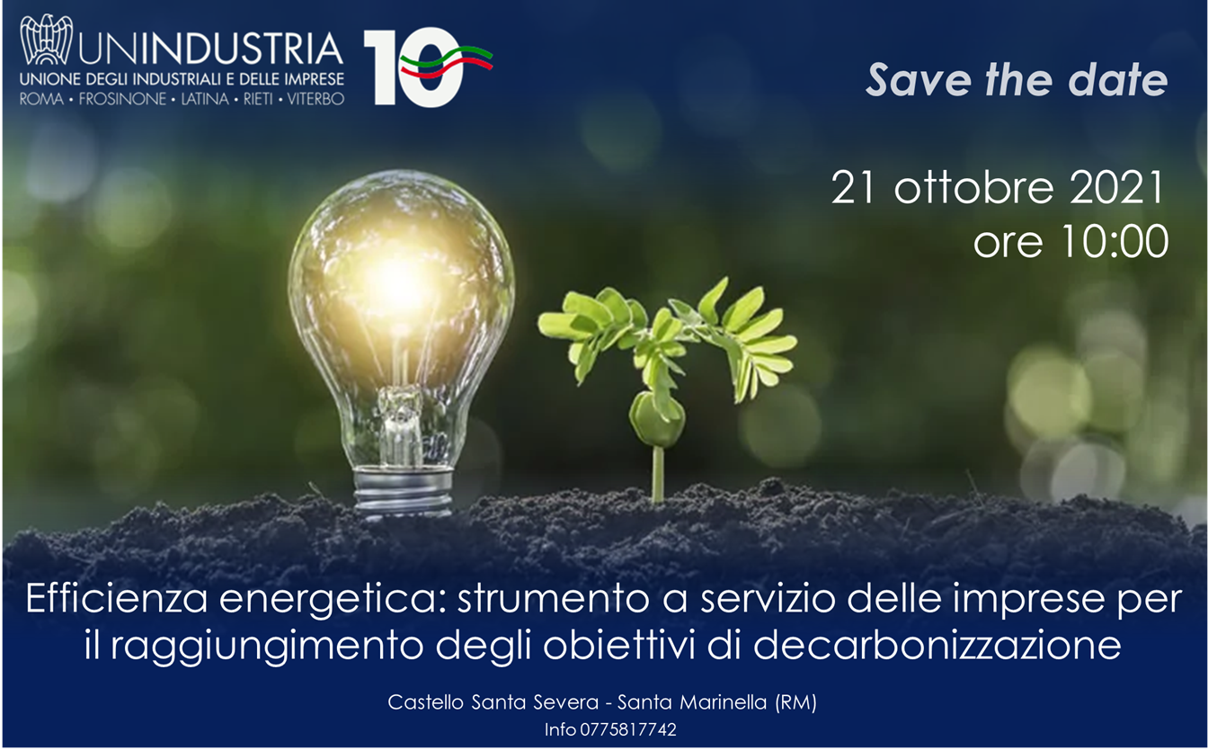 Si terrà il 21 ottobre alle ore 10 il convegno "L'efficienza energetica: strumento delle imprese per il raggiungimento degli obiettivi di decarbonizzazione".