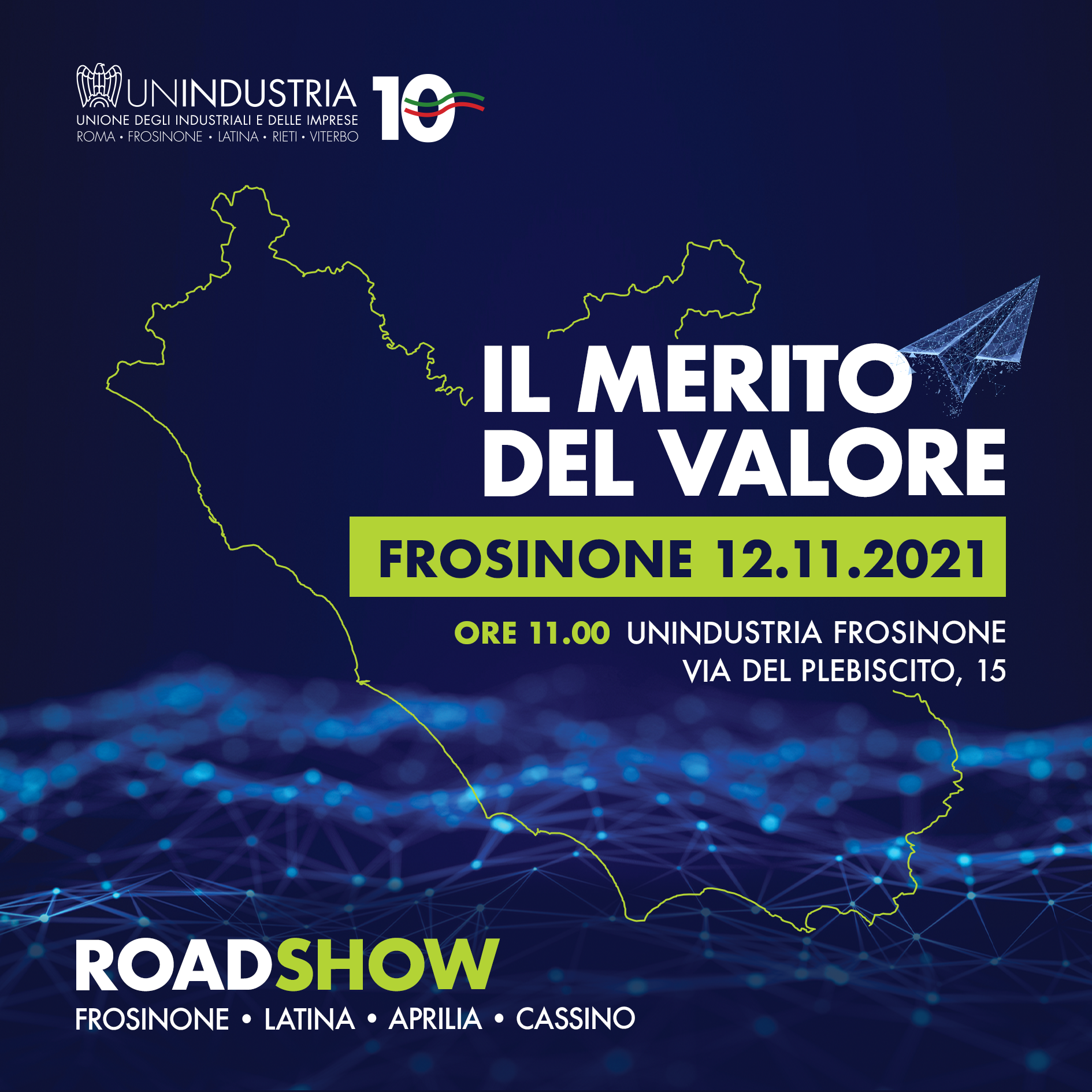 Dopo il primo appuntamento dell’Alto Lazio, dedicato ai territori di Viterbo, Rieti e Civitavecchia, ci sarà ora quello del Lazio meridionale, rivolto ai territori di Frosinone, Latina, Aprilia e Cassino e poi quella conclusiva di Roma e Lazio, il prossimo 15 dicembre. Nei tre incontri, ospitati presso le sedi di Unindustria rispettivamente a Viterbo, Frosinone e Roma, saranno presenti imprenditori e ospiti illustri, i quali si confronteranno sulle loro storie di impresa, sui valori e sulla scoperta dell'associazionismo, sul futuro del Lazio. Gli appuntamenti sono moderati dalla giornalista RAI Giorgia Cardinaletti ed aperti dal cortometraggio "10 anni: il merito del valore".