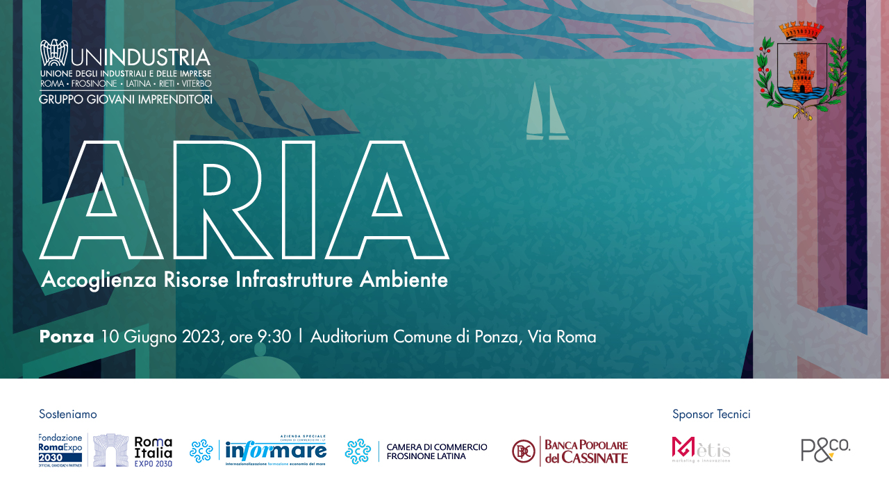 Per la prima volta il Gruppo Giovani Imprenditori di Unindustria approda sull'isola di Ponza per il Convegno "ARIA - Accoglienza Risorse Infrastrutture Ambiente": appuntamento sabato 10 giugno 2023 alle ore 9:30 presso l'Auditorium in via Roma.