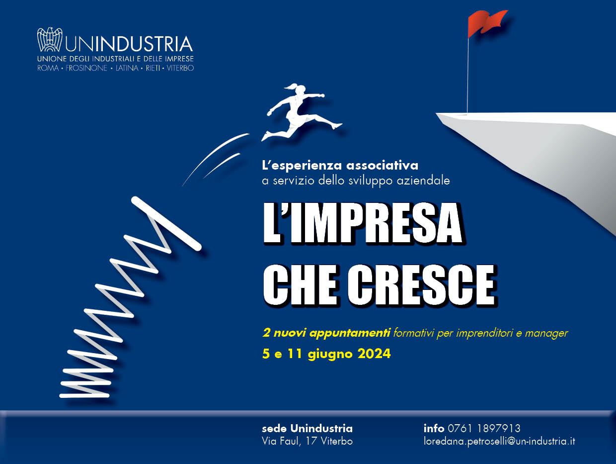 'L'impresa che cresce: l'esperienza associativa a servizio dello sviluppo aziendale' è il secondo ciclo del percorso formativo dedicato a imprenditori e manager associati di Unindustria che si terrà il 5 e 11 giugno nella sede di Unindustria Viterbo