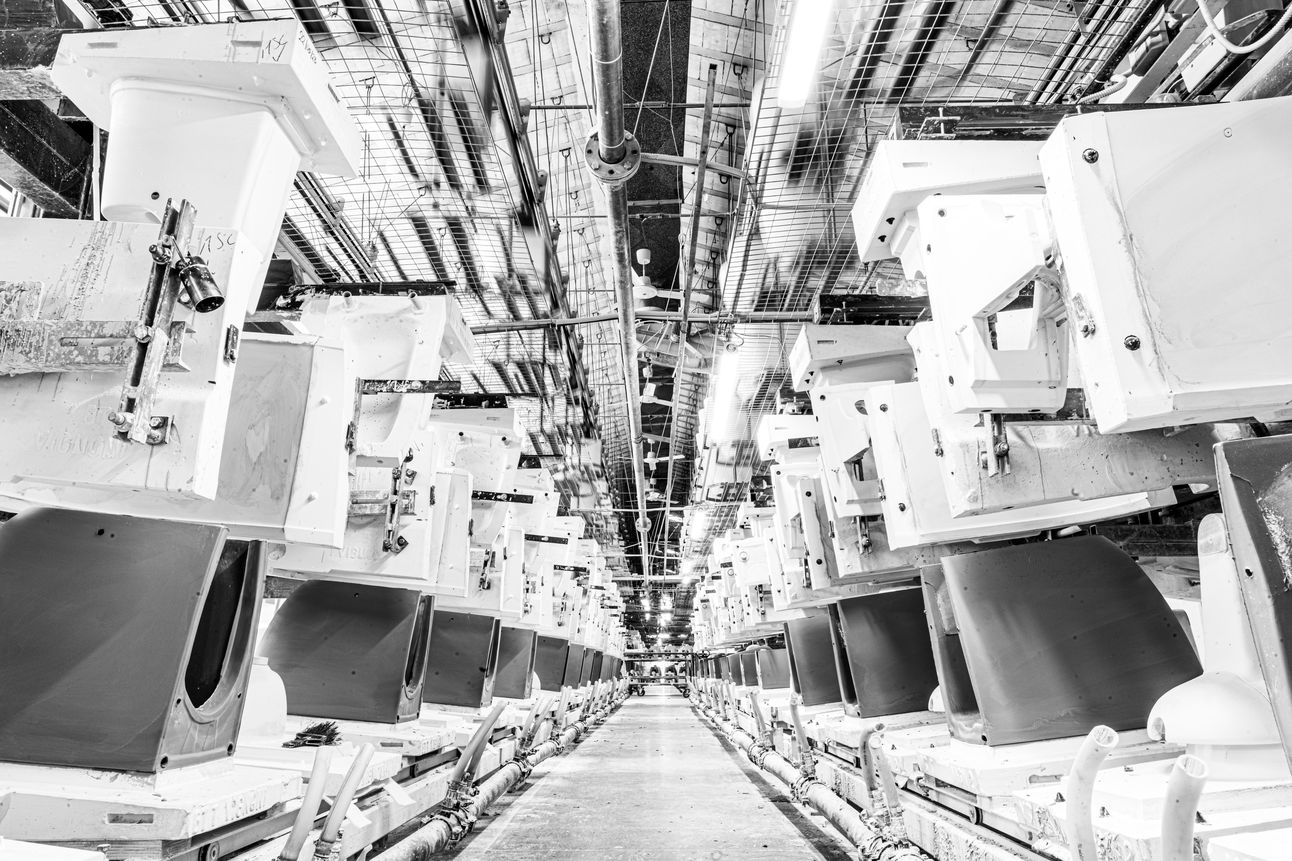 La sala impasti interna per la produzione dell’impasto liquido per il colaggio semiautomatico, il sistema meccanico di trasporto dei prodotti nelle varie fasi di lavorazione che funge anche da sistema di “essiccazione” naturale, i robot di applicazione degli smalti, il forno a tunnel a ciclo continuo lungo centoventi metri che produce più di duecentomila pezzi di ceramica sanitaria l’anno: sono questi gli strumenti intorno ai quali si sviluppa l’intero processo produttivo aziendale.